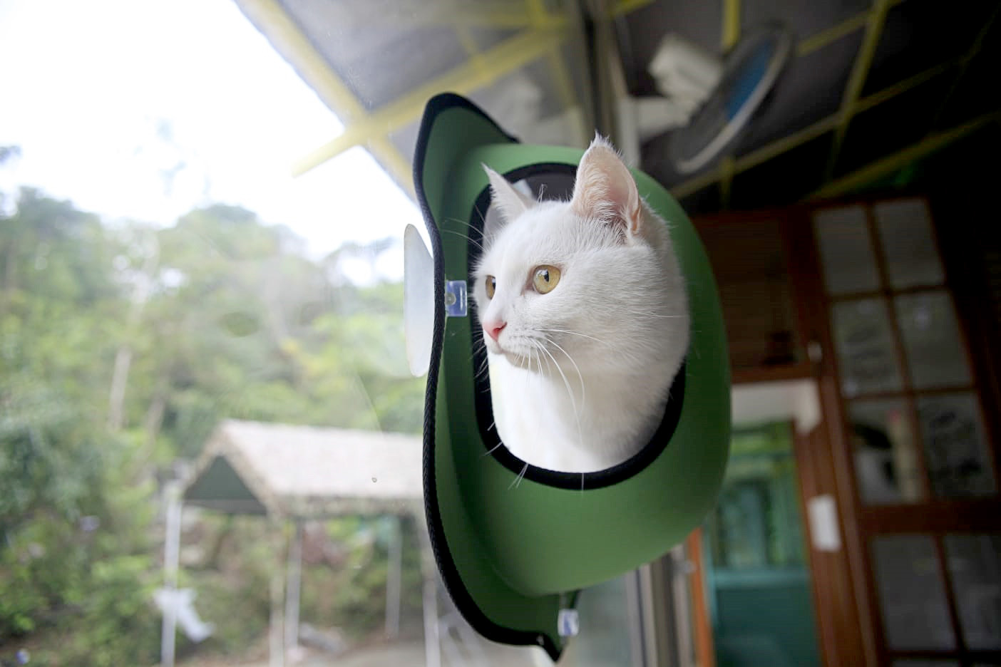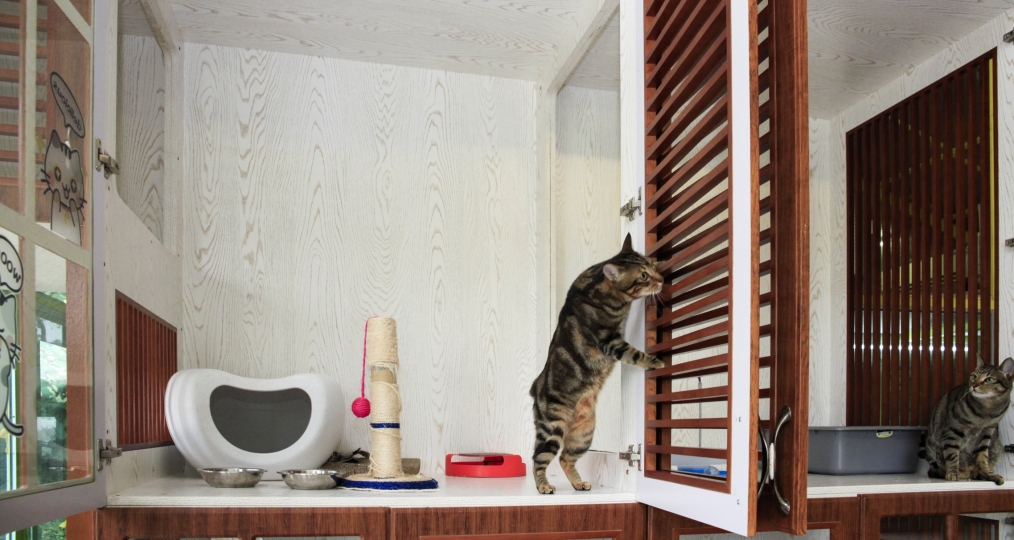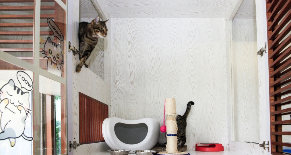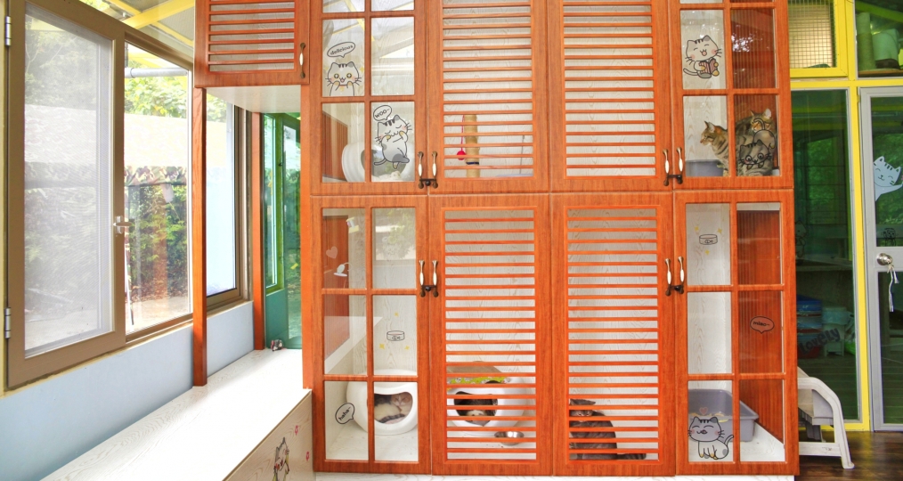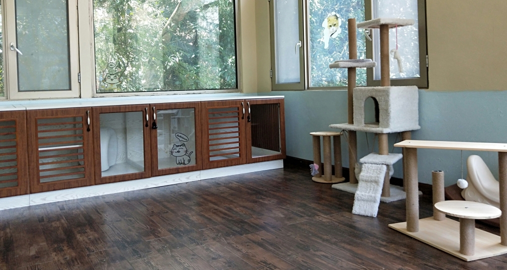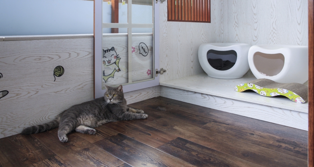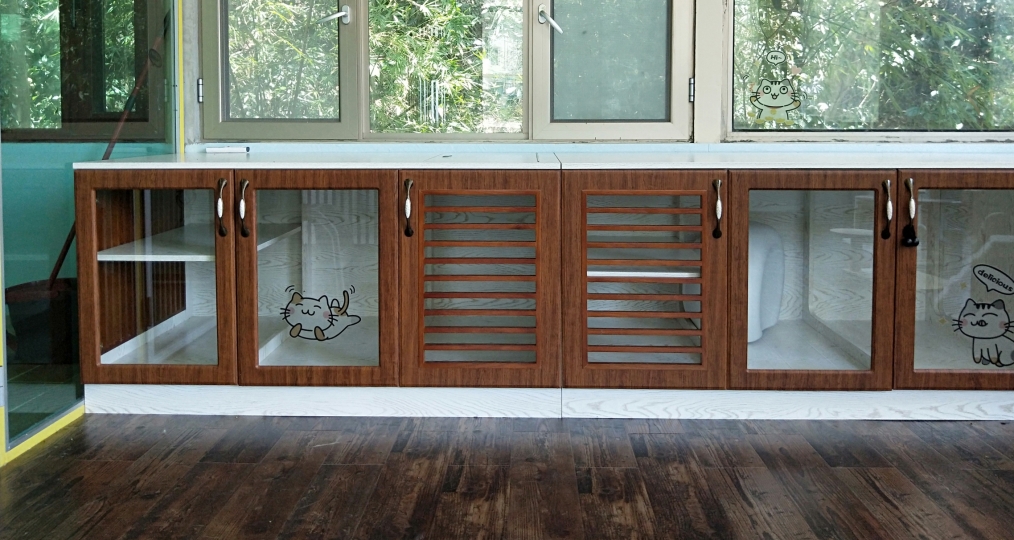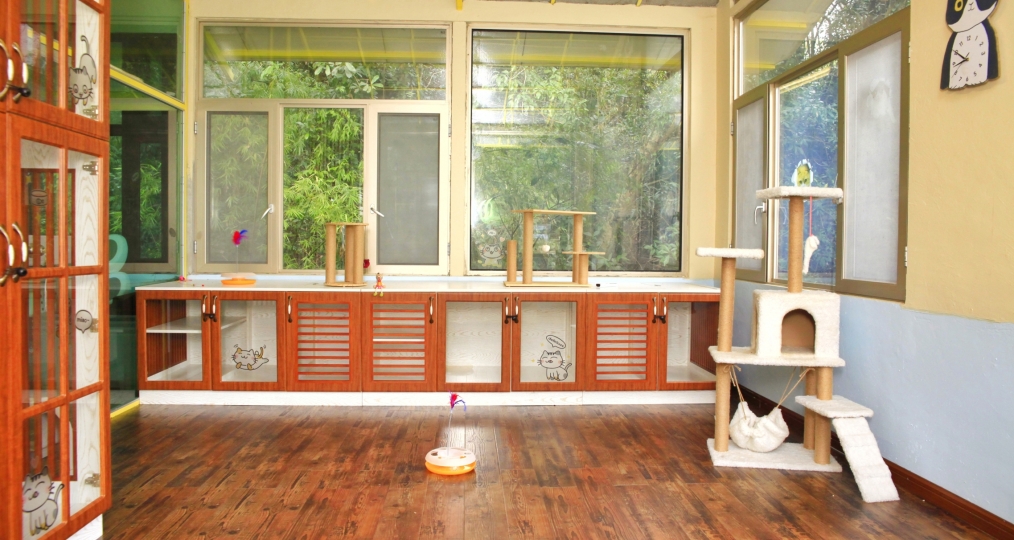 陽光貓舍西翼是落地式玻璃設計,意在滿足貓貓們求知探討外界的慾望,寬敞的空間可以保證貓貓每天攀爬跳躍的運動需求,也適合多貓的家庭同住。而東翼顛覆傳統的“貓籠”設計,採用環保木材打造成寬敞的木櫃,滿足“躲貓貓”的天性,全屋木地板及超大的落地窗設計,讓貓貓們猶如回歸大自然,隨時隨地沐浴自然的風光。此外,貓舍備有空調及暖爐設施以應對不同的氣候。